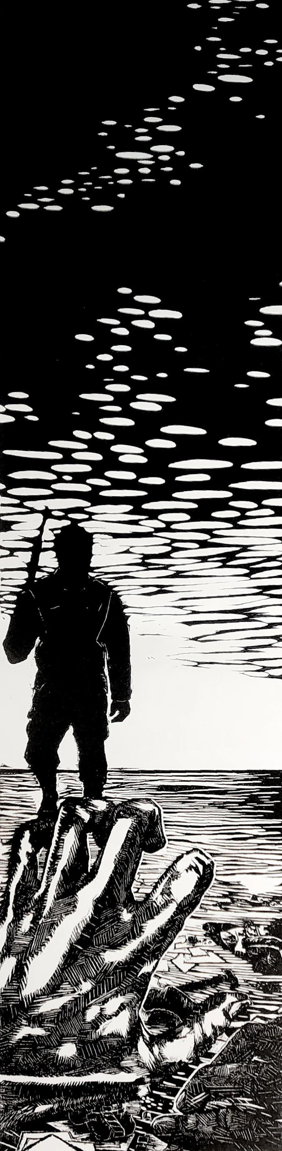 This three part varied edition tells the story of recovery from sexual assault. The medical records used to bind the fishbone book containing this print paint a picture of the physical toll of this event as well as the lasting repercussions.